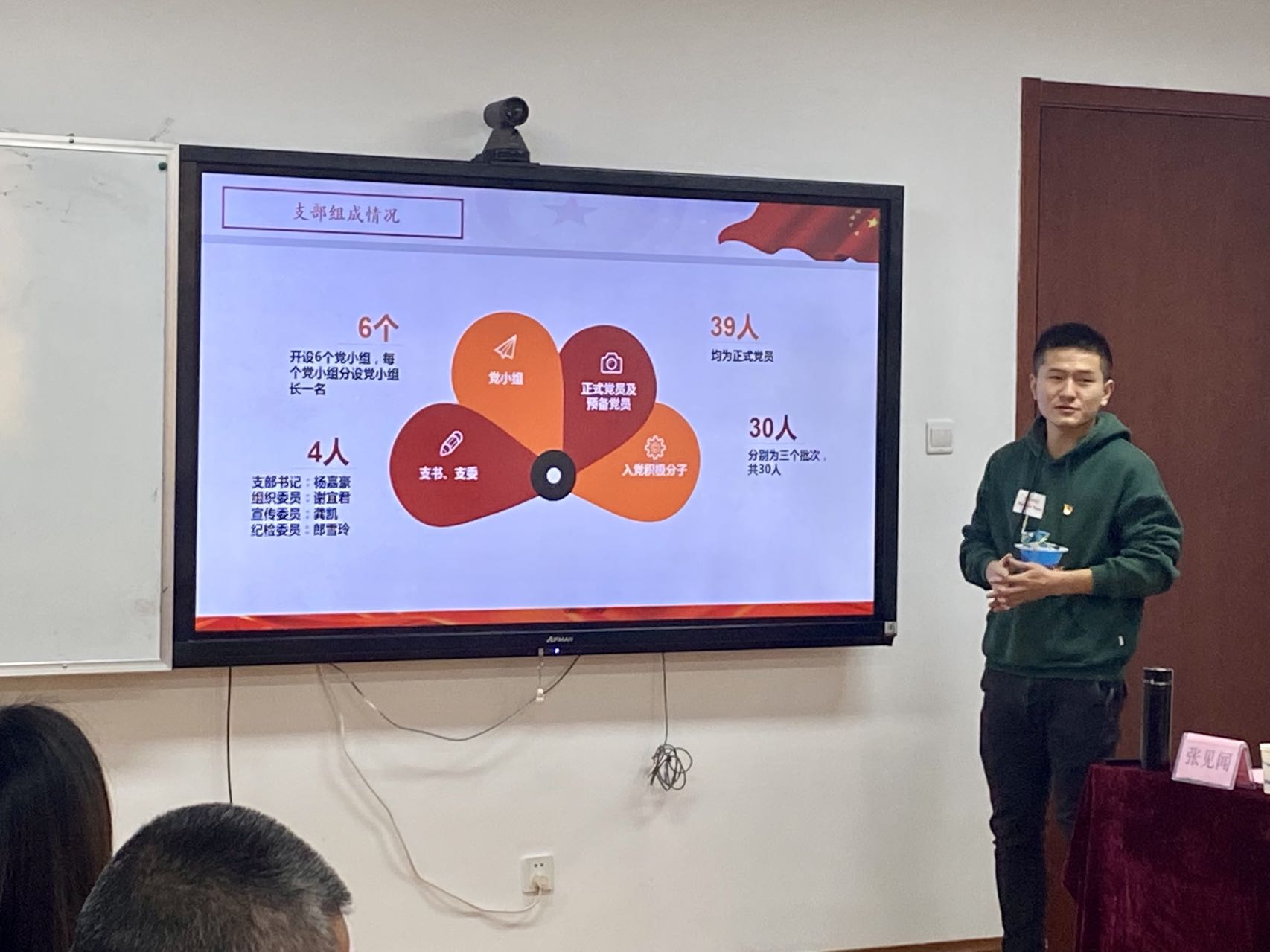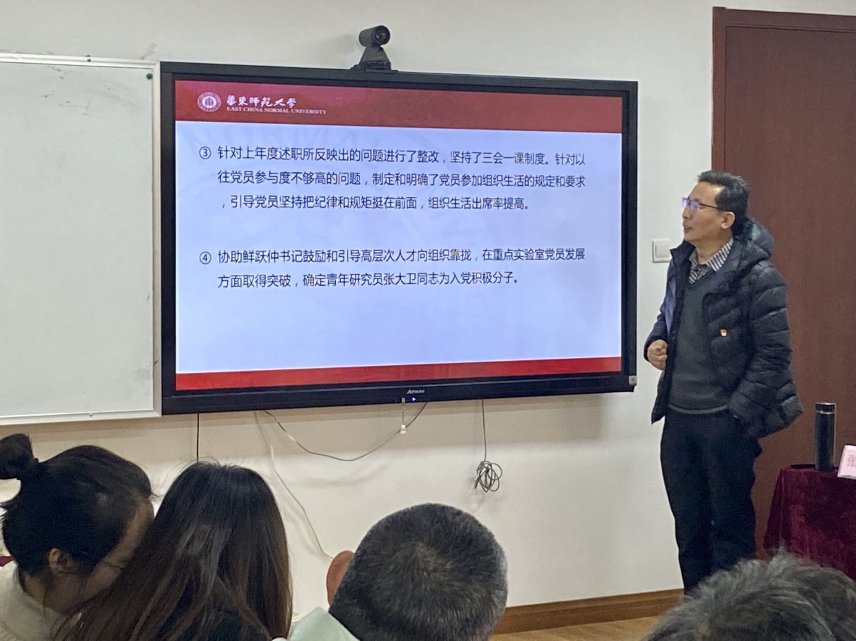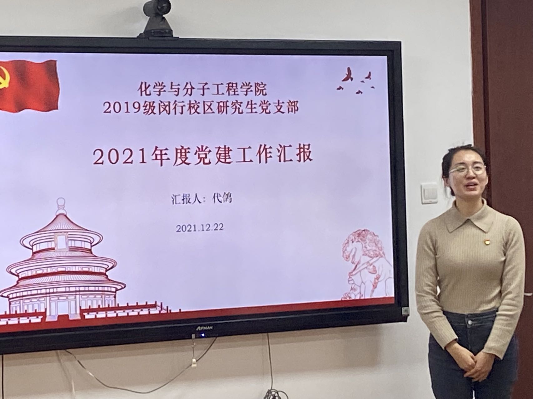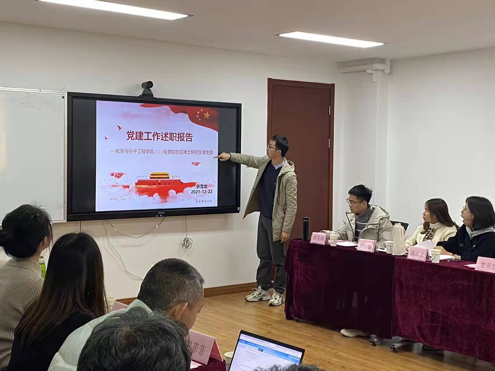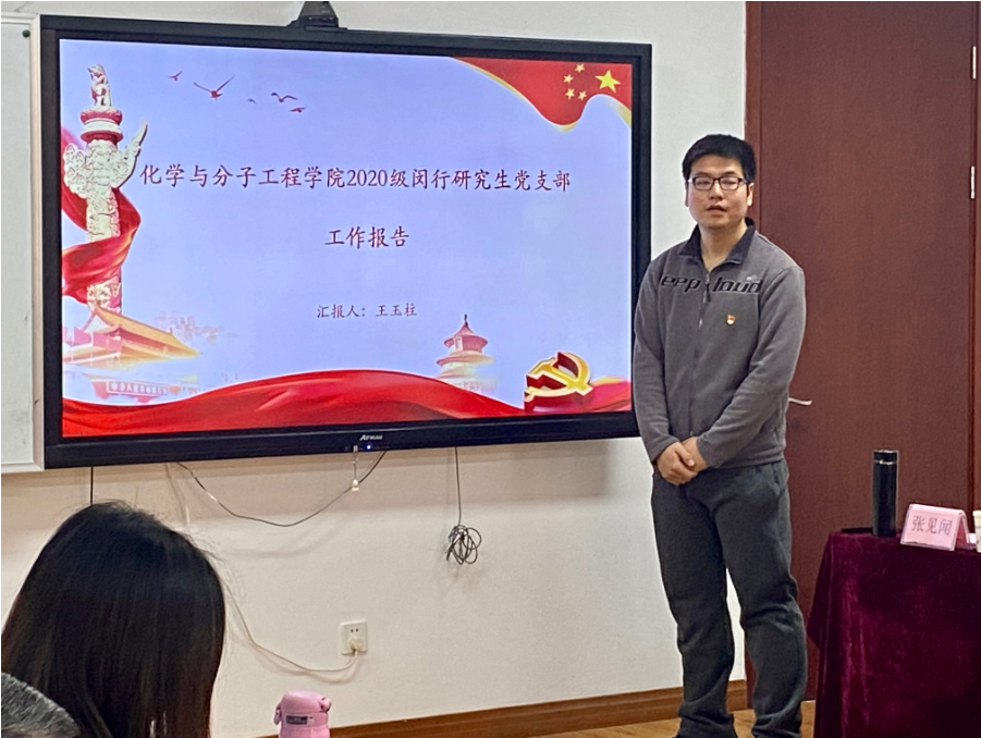 之后,普陀校区高年级研究生党支部书记楚萌恩、2019级博士研究生党支部书记乔雪龙、2020级研究生党支部书记杨嘉豪以及闵行校区2019级研究生党支部书记代鸽和2020级研究生党支部书记王玉柱分别从支部概况、工作开展情况以及支部工作中存在的不足与改进措施等方面进行了汇报,鲜跃仲、王婷婷、谢美然、马士禹和孔爱国老师分别对5位学生党支部书记抓党建工作情况进行了点评,就党课形式、支部特色、党员发展考核等方面提出了意见建议并鼓励学生党支部进一步通过扎实工作争先创优。