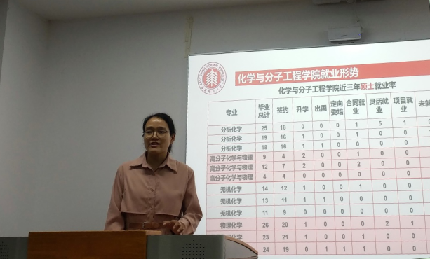 首先,王琳老师指出2021届或将迎来史上最难就业季。受疫情影响,本年度招聘市场萎缩,原有的产业被迫转型,餐饮、零售、外贸等行业遭受打击,此外,因求职方式的转变,个体求职竞争将更加激烈。不过,王老师也列举了化学院近三年的就业率,指出在过去的三年里,化学院就业工作成效显著,就业各项指标表现良好,因此,不论就业形势如何,抓住求职黄金期,积极开展求职工作,才是正确的应对之道。