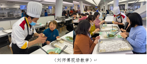 上海市“五一劳动奖章”获得者、“玉米炒葡萄”创意菜发明人刘玉红师傅耐心地为学院教师讲解包饺子妙招,从取馅儿、放馅儿到如何捏口,手把手传授美味水饺制作技巧。