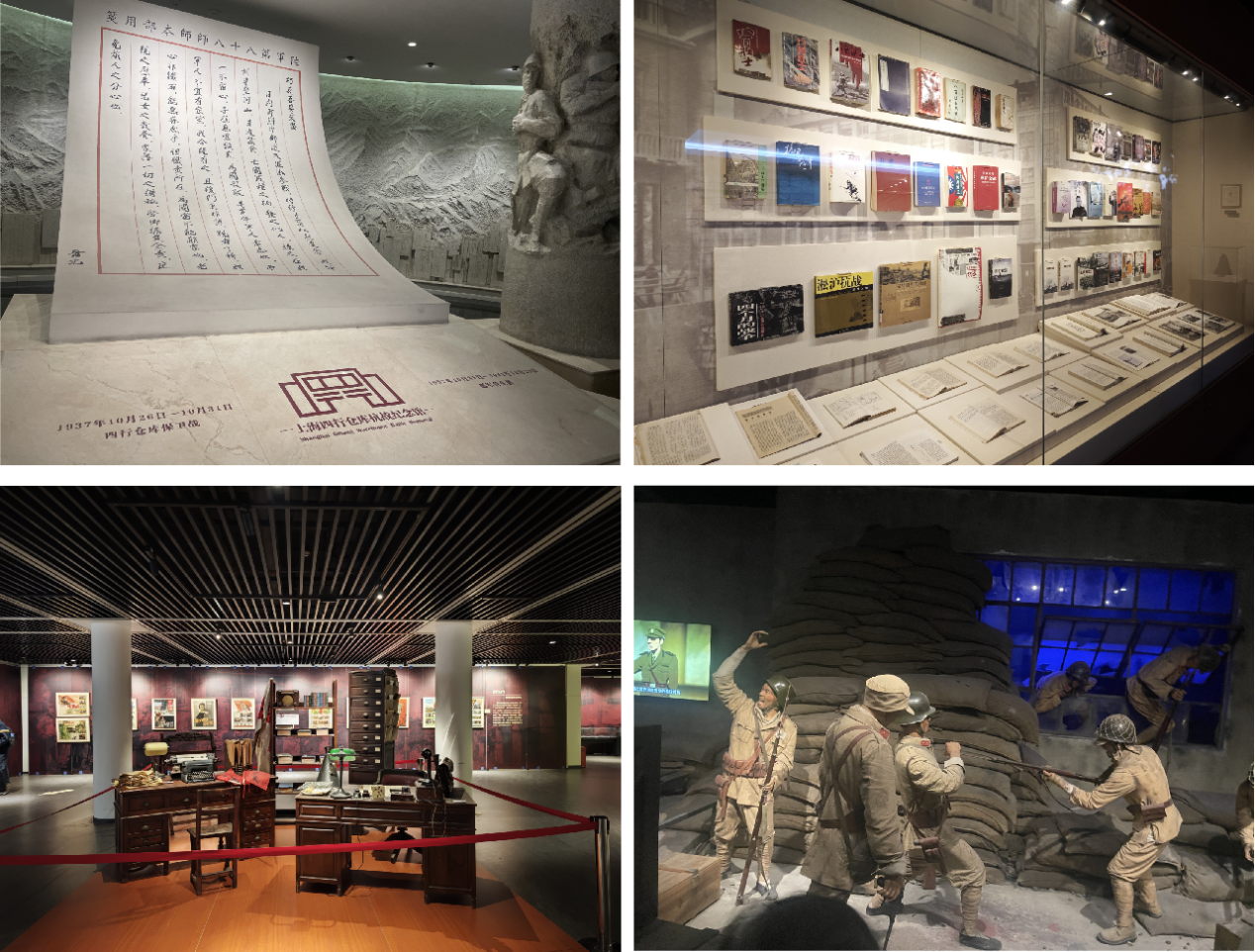 走进庄严肃穆的纪念馆,一张张泛黄的老照片、一件件锈迹斑斑的实物、一个个复原的战斗场景,生动再现了1937年淞沪会战中,谢晋元将军率领“八百壮士”坚守四行仓库、浴血奋战的英雄壮举。纪念馆分为“序厅”“血鏖淞沪”“坚守四行”“孤军抗争”“不朽丰碑”和“尾厅”五个板块。展览综合了历史实物、蜡像雕塑、战斗场景和影视片等多种展示形式,生动还原了那段共御外侮的历史事实。