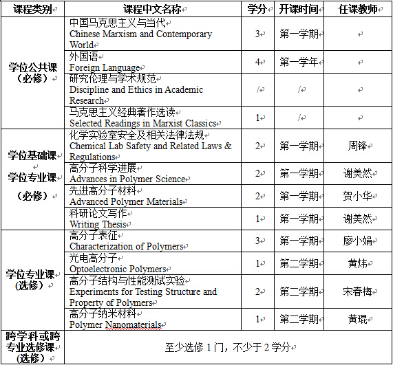(二)在高分子学科上掌握坚实宽广的基础理论和系统深入的专门知识,同时要掌握一定的相关学科知识,具有独立从事科学研究工作的能力,在科学或专门技术上做出创造性的成果。