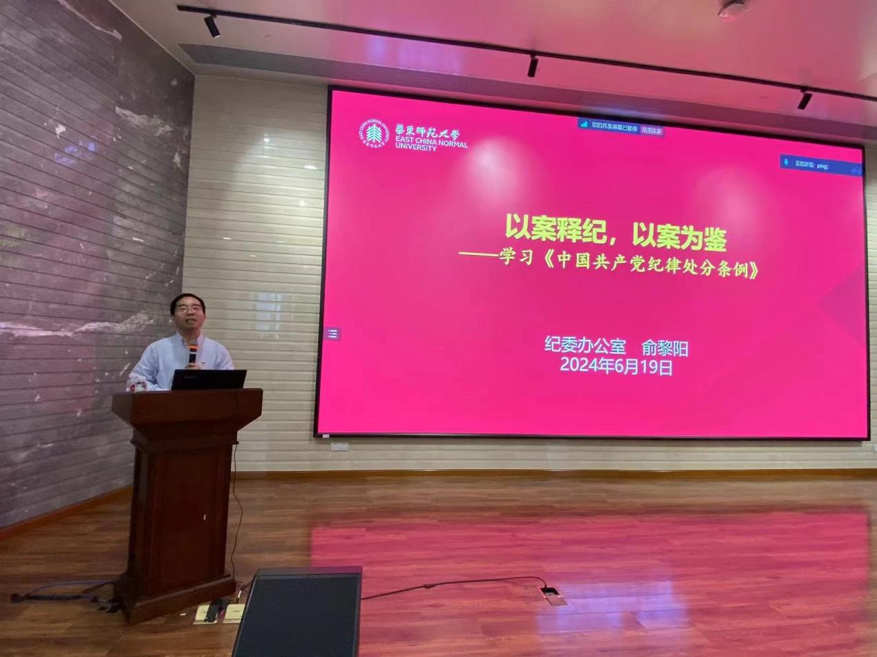 为深入学习贯彻习近平总书记关于加强党的纪律教育的重要论述,推动党纪学习教育入脑入心走深走实,2024年6月19日下午,老司机 举行师生党员集中培训暨党纪学习教育专题党课。校纪委副书记、纪委办公室主任、监察处处长俞黎阳作“以案释纪,以案为鉴——学习《中国共产党纪律处分条例》”的专题辅导报告,报告会由院党委书记王媛媛主持。全院五百余名师生党员分别在闵行、普陀两校区会场参加学习。