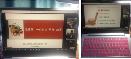 田院长首先致辞,表达了对学院工会的感谢,并祝愿老师们节日快乐,宅家愉快。随后,田芳医生从“深色蔬菜营养多”、“烹饪不当毁营养”、“‘跨界’蔬菜——你值得拥有”和“喝果蔬=吃果蔬?你想简单了”等四个方面,结合老师们之前收到的蔬菜,为大家详细讲解了吃蔬菜的重要性和相关常识。在讲座的最后,田医生提醒大家:1.从健康角度出发,每天要保证吃300-500克蔬菜,并且要注意选择深色的蔬菜;2.要记得吃“跨界”蔬菜,例如,在吃绿叶蔬菜的同时,也要注意搭配豆制品、菌藻类等其他品类的蔬菜;3.烹饪蔬菜要注意控制用油;4.水果不能替代蔬菜,因为蔬菜中的维生素K和植物纤维等都比水果丰富很多。