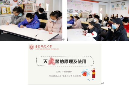 紧接着,来自“小化狮”实践团队的敬婷老师着重向大家介绍了泡沫灭火器、清水灭火器和卤代烷灭火器的原理和使用方法。同学们聆听了小敬老师对泡沫灭火器化学原理的讲解,也观看了自制泡沫灭火器的视频实验,大家产生了极大的兴趣。此外,小敬老师还为大家解释了卤代烷灭火器目前已全面停用的原因。课堂最后,在小敬老师的带领下,通过一问一答、自我梳理的方式对本次课程进行了复习强化,同学们出色地完成了老师们布置的随堂练习。
