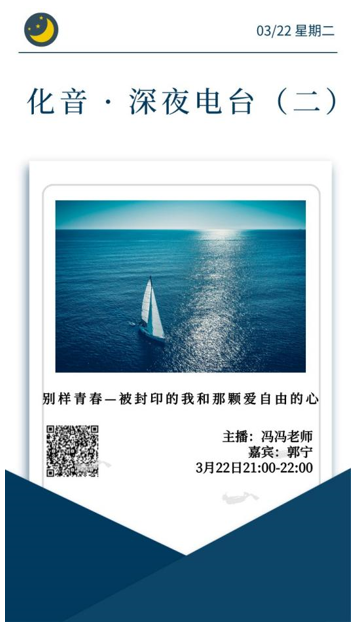 2022年3月22日晚9点,“化音”深夜电台第二期栏目继续与大家相见,本期特别邀请了来自华师大社会发展学院的大四本科生郭宁同学担任嘉宾,与主播冯琪老师一起,为大家带来了一场主题为“‘别样青春’:被封印的我和那颗爱自由的心”的深夜谈话,尝试与大家一起探讨关于被疫情影响的青春。