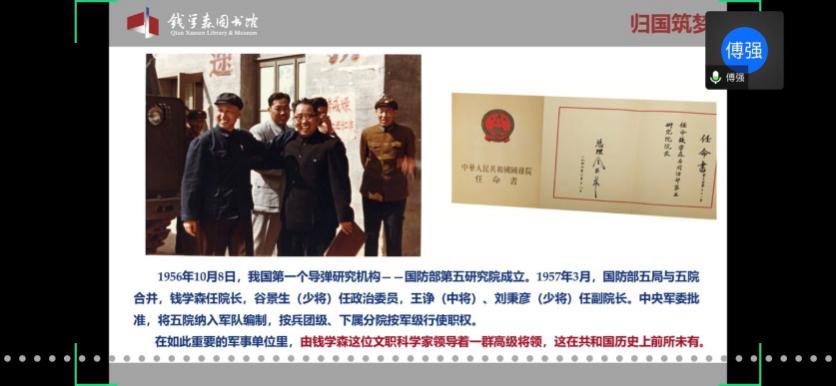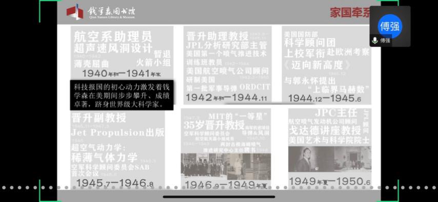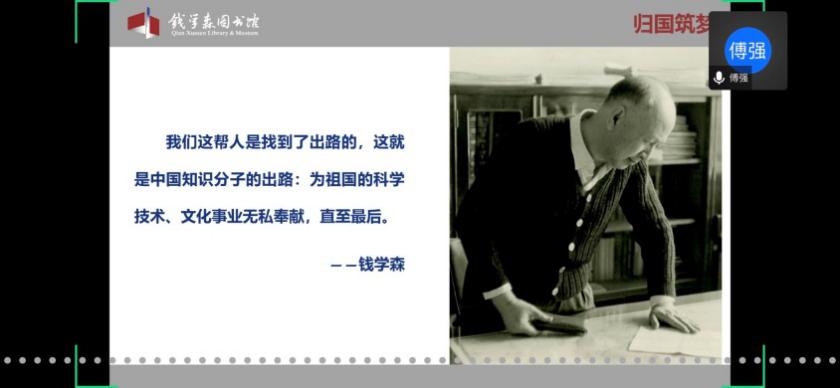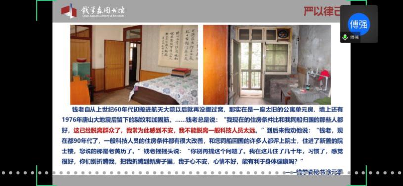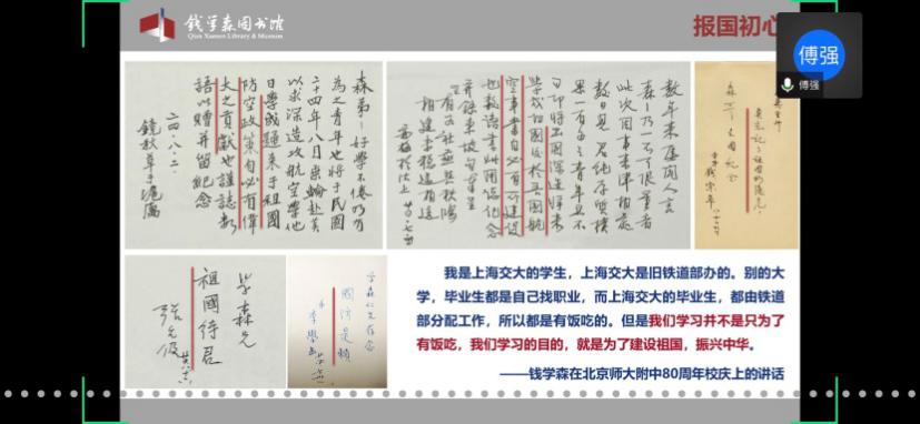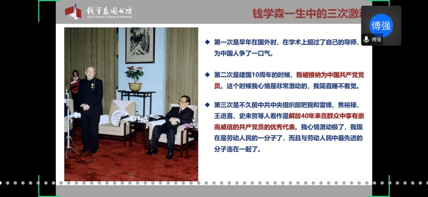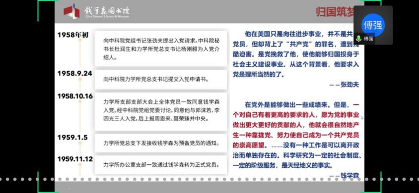 馆内基本展览分为“中国航天事业奠基人”、“科学技术前沿的开拓者”、“人民科学家风范”和“战略科学家的成功之道”四个部分。在傅老师的带领下,学员们通过网络360°全景参观了钱馆,领略了作为优秀共产党员的钱学森先生的高贵品质,理解了“不忘初心,牢记使命”的深刻内涵。傅老师也欢迎大家在疫情结束后,到华山路1800号钱馆实地参观。