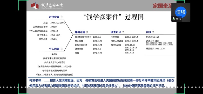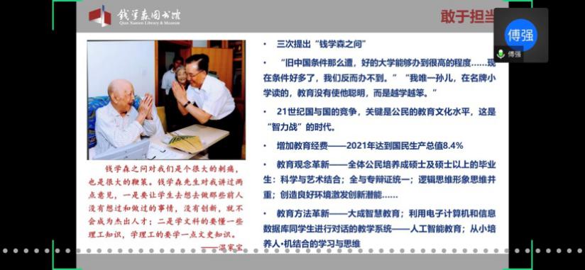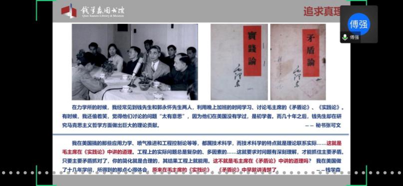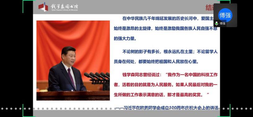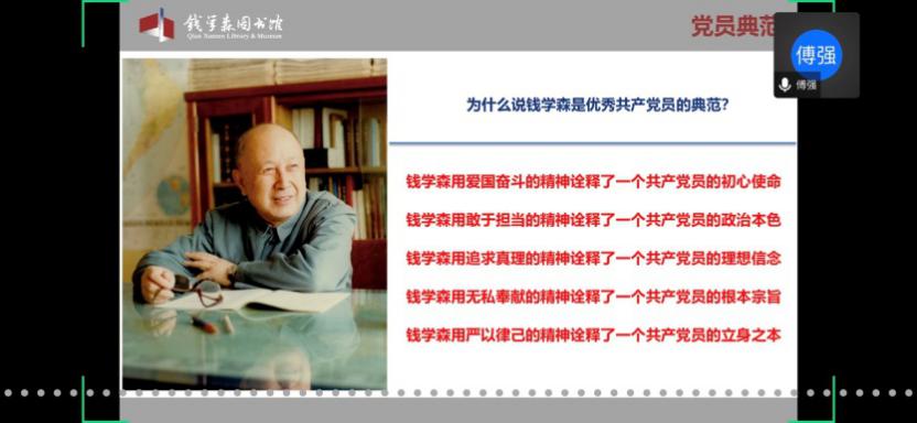 首先,童老师欢迎并介绍了本次党校培训班的主讲嘉宾傅强老师。傅老师是上海交通大学钱学森图书馆社教宣传部部长、副研究馆员,也是中国浦东干部学院课外教学点教员、上海市委宣传部东方讲坛特约讲师、资深博物馆教育工作者。本次党校培训班的内容包括两个板块,第一版块是依托钱学森图书馆(以下简称钱馆)“虚拟漫游馆”,由傅强老师带领学员们“云导览”;第二版块是题为“优秀共产党员——人民科学家钱学森”的主题报告。