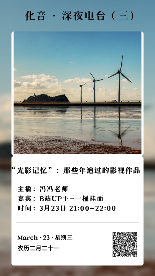 2022年3月23日晚9点,“化音”深夜电台继续与大家线上相见。本期以“‘光影记忆’:那些年追过的影视作品”为主题,邀请了B站UP主(学院2020级博士)田峥同学担任嘉宾,与主播冯冯老师一起畅聊了那些年影视作品中的“爱恨情仇”和悲喜人物,交流了在疫情防控的背景下,我们如何通过听好音乐、看好电影调节身心。