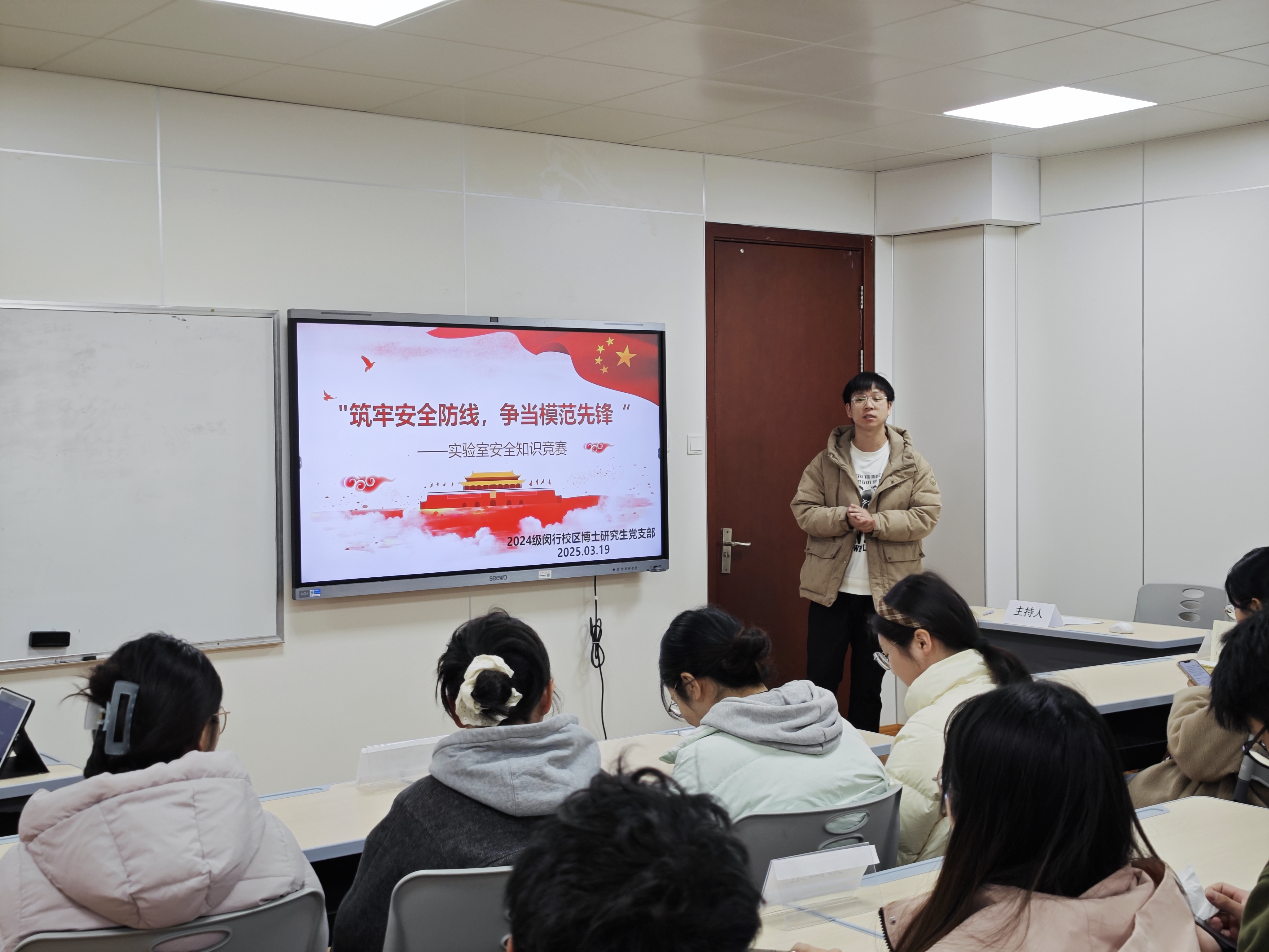 为深入贯彻落实党的二十大报告中"坚持安全第一、预防为主"的指导方针,积极响应教育部《高校实验室安全专项行动》要求,进一步强化党员的安全责任意识,提升实验室安全素养,营造全员参与的安全管理氛围,老司机 2024级闵行校区博士研究生党支部于2025年3月19日在化学楼122教室举办了主题为"筑牢安全防线,争当模范先锋"实验室安全知识竞赛。