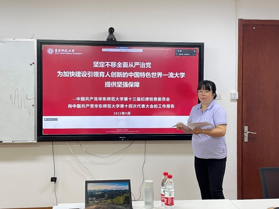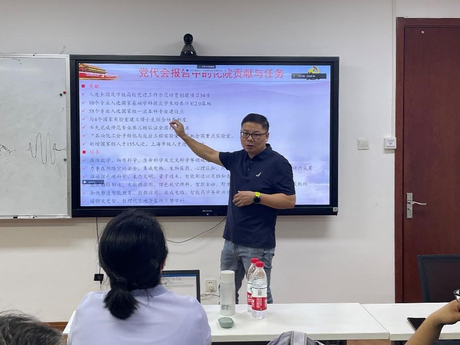 鲜跃仲从大会的基本情况、主题、过去五年学校的成绩进步和经验启示、学校发展的未来愿景与使命任务、未来五年学校发展的奋斗目标与总体思路及具体举措等方面对学校第十四次党代会进行了详细介绍。鲜跃仲谈到,校党委报告以“9个持续”对学校第十三次党代会以来五年的工作进行了回顾,从党的建设、立德树人、人才培养、教师教育、科学研究、学科建设、师资队伍、社会服务、内部治理9方面的“新”,展示了校第十三届党委带领全校师生围绕“育人、文明、发展”三大使命,通过实施“教育教学创新引领”“学科科研优化提升”“国家战略精准对接”三大工程,推动学校事业高质量发展、取得的成绩进步。报告凝练总结了坚持党的全面领导、牢牢把握“国之大者”、牢记“为党育人、为国育才”初心使命、唯卓越方可立足四个方面的成功经验和规律性认识,对于学校继往开来、传承创新、砥砺奋进弥足珍贵。面对新形势新任务,校党委报告对人才培养、科学研究、合作开放、治理水平以及党的建设等方面存在的短板不足进行了深入分析。鲜跃仲表示,校第十四次党代会明确提出我校要在2035年我国建成教育强国、实现教育现代化之际跻身世界一流大学行列,这既激动人心,又责任重大。全院师生要以时不我待的紧迫感、舍我其谁的责任感、踔厉奋发的精气神,主动承担起加快建设中国特色世界一流大学的重任。鲜跃仲指出,校党委报告明确了未来五年的奋斗目标就是要抓住高校新一轮转型发展的战略机遇,聚焦“两个先行先试”,实现学校事业更高质量发展,为建设引领育人创新的中国特色世界一流大学奠定坚实基础。学院师生要牢记“国之大者”,胸怀“两个大局”,树立“唯卓越方能立足”的理念,在全面提高人才自主培养质量、造就拔尖创新人才,服务区域经济社会发展、优化布局结构上做出卓越而独特的贡献,为全面建成社会主义现代化强国提供人才支撑并通过更加积极主动、更高质量服务国家和区域发展需求来实现自身和学院的高质量发展。鲜跃仲强调,校第十四次党代会已经描绘了学校未来发展的蓝图,学院师生都是加快建设引领育人创新中国特色世界一流老司机 的亲历者、生力军,大家要深刻认识到校第十四次党代会是在全面贯彻落实党的二十大精神,加快建设教育强国,全力推动学校“十四五”规划实施和新一轮“双一流”建设关键时期召开的一次重要会议,学校的发展站在新的历史和时代方位,作为中国教师教育领军者、教育现代化国家队、上海“五个中心”建设生力军的老司机 面临新的发展机遇与挑战,学院的每一位师生都要深刻领会引领育人创新的核心要义,充分发挥主人翁精神,凝心聚力,与学院、学校同频共振,以实际行动对标对表重点推进的卓越育人、卓越学术、卓越服务“三大卓越工程”,紧紧锚定“五个一流行动计划”,主动认领并高质量推进落实党委报告中的化学院任务,为学校2035年跻身世界一流大学作出新贡献。
