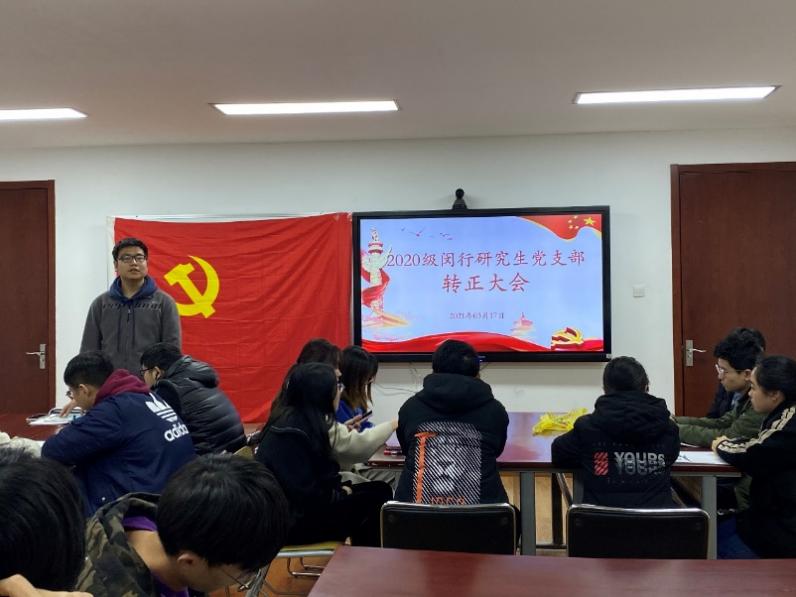 2021年3月17日下午13:30,2020级研究生党支部在化学楼126会议室开展了“2020级闵行研究生支部转正大会”以及“人民的世纪 革命的情怀”为主题的党日活动。转正大会由支部书记王玉柱主持,对王婷婷、陈丰萍、曹梦瑶、杨正一四位预备党员同志的转正展开了讨论并投票。