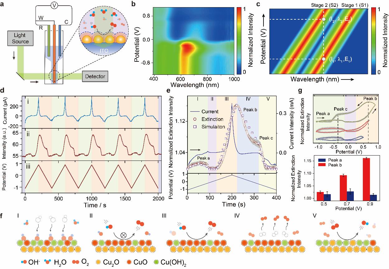 然而,常规电化学表征手段缺乏分子识别功能,无法获取电极溶液界面的复杂气体分子扩散信息。为解决该挑战,本工作通过构筑具有等离激元和高效催化特性的双功能电极界面,利用等离激元的光学信号监测电化学析气反应。以氧气析出过程为模型,通过监测界面反应过程中催化剂状态改变和产物扩散所导致等离子体纳米结构的吸收光谱扰动,获取了界面气体扩散过程信息,发现了电极溶液界面处氧气产物分子的多步扩散过程和气体聚集对电子传递的抑制效应。利用上述信息,通过引入程序电位扫描还原氧气产物,消除界面吸附氧气的抑制,提高了电极反应效率。该工作为气体析出反应过程的监测和提高电催化效率提供了新的思路(图1)。