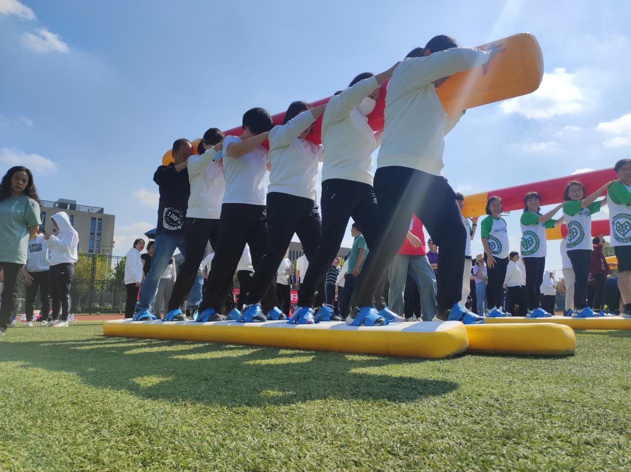 教师们齐心协力,在协力竞走项目中配合默契,肩并肩行进,如龙舟在水中疾驰。在现场师生们的欢呼声中,他们顺利完成了比赛,展现了团队协作的风采。