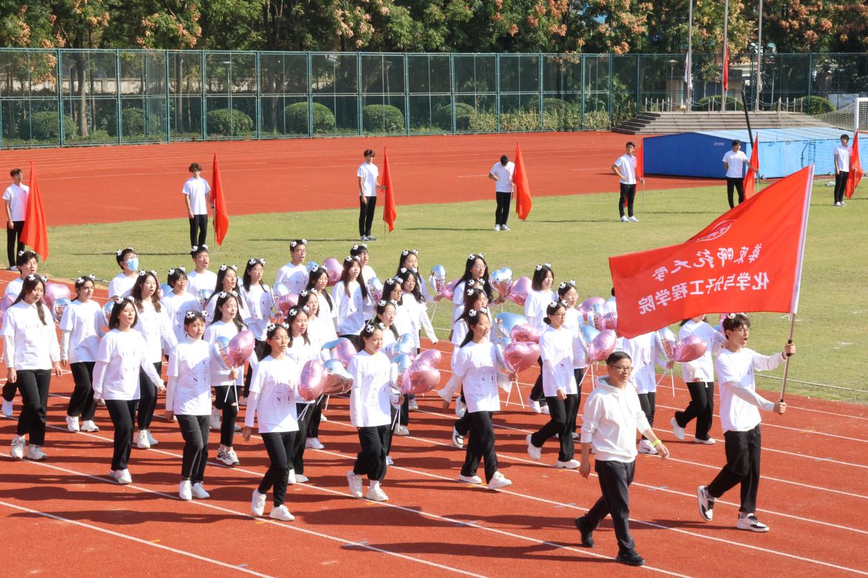 在方阵展示环节,同学们为现场观众带来了活力满满的舞蹈表演《开心往前飞》,大家随着音乐的节拍跳跃、舞动,为开幕式带来了独属于化院的青春气息。凭借精彩的演出,方阵荣获入场式比赛第三名!