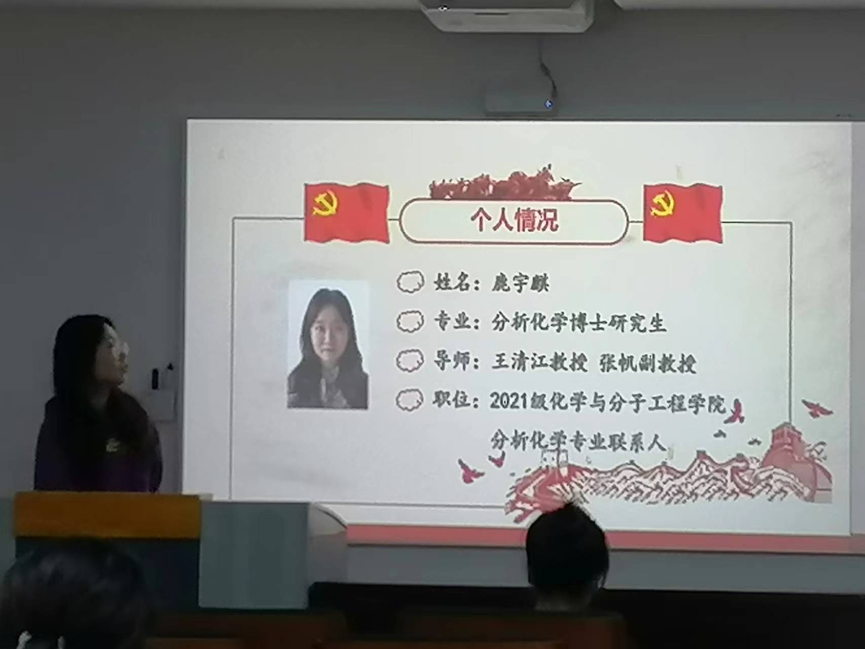 随后,学生支部的党员代表就科研、学习展开了精彩的分享。裴昊老师课题组2021级博士研究生朱韵做了科研分享,展示了研究课题的突破性,科研压力与动力无缝衔接,并透露了“慢就是快”的小秘诀。王清江老师课题组2021级博士研究生鹿宇麒做了学生工作分享。她的硕士与博士都是在我院就读,硕士阶段担任院研会文艺部干事、部长,博士阶段担任2021级分析化学专业联系人。鹿宇麒谈了自己不同的阶段有不同的感悟与精彩,科研工作与自身特长发展兼顾。2021级硕士研究生康琼文谈起科研习惯方面,信念、情绪、效率能量满满,脸上洋溢着阳光与自信。2021级硕士研究生陈文艺从完备组织建设、学术创业并进、丰富文体活动、做好权益服务、工作总结五个维度全面介绍了自己在学院研会工作的日常。优秀的人总有相似,又与众不同!