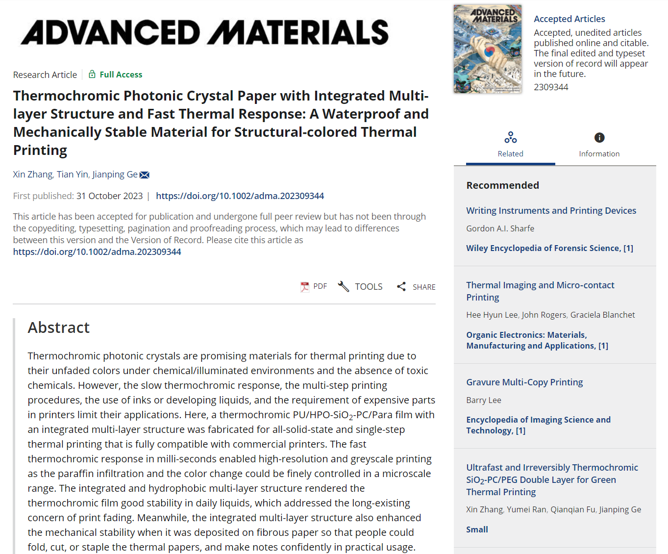 热致变色光子晶体是一类绿色环保的新型热敏打印材料。与传统基于Leuco染料和显影剂的热敏纸不同,热致变色光子晶体具有衍射可见光而产生的结构色,在各种化学及辐照条件下不易褪色,具有良好的显色稳定性。此外,热致变色光子晶体不含有害的染料或显影剂,如传统热敏纸中干扰人体雌激素活性的双酚A和双酚S,因此符合健康环保的需求。然而颇为遗憾的是,已报道的热致变色光子晶体由于变色响应缓慢、印刷过程步骤多、使用油墨/显影液液体耗材、依赖高功率激光器件等原因,很少应用于热敏印刷。最近,我院葛建平教授团队报道了一种具有多层一体化结构的新型热致变色光子晶体材料,并开发了防水稳定可剪裁的光子晶体绿色热敏纸和基于该材料的快速热敏印刷技术,相关成果在线发表在材料学领域顶尖学术期刊Advanced Materials (2023, DOI: 10.1002/adma.202309344)上。