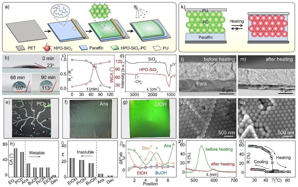 图1. PU/HPO-SiO2-PC/Para一体化多层膜的制备及热致变色过程