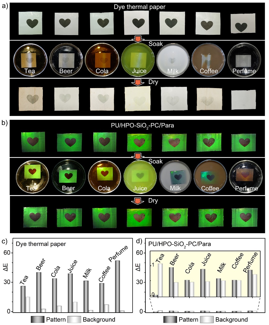 图2. 光子晶体热敏纸与传统热敏纸的溶剂稳定性对比