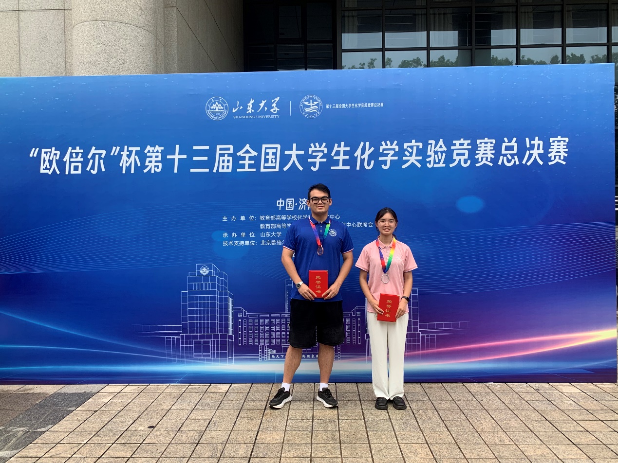 2024年8月15日至18日,第十三届全国大学生化学实验竞赛总决赛于山东大学中心校区举行。21级拔尖班靳婉玥和吴振飞两位同学与来自全国129所高校的174名学生同场竞技,最终取得了二等奖和三等奖的好成绩!