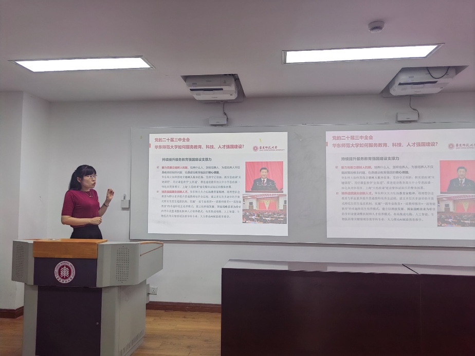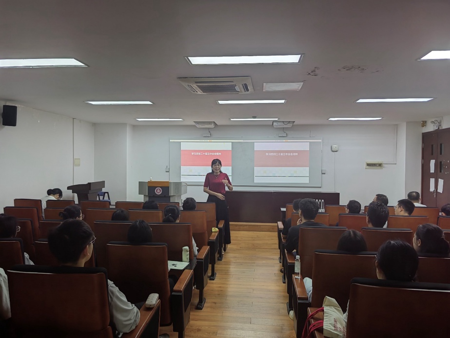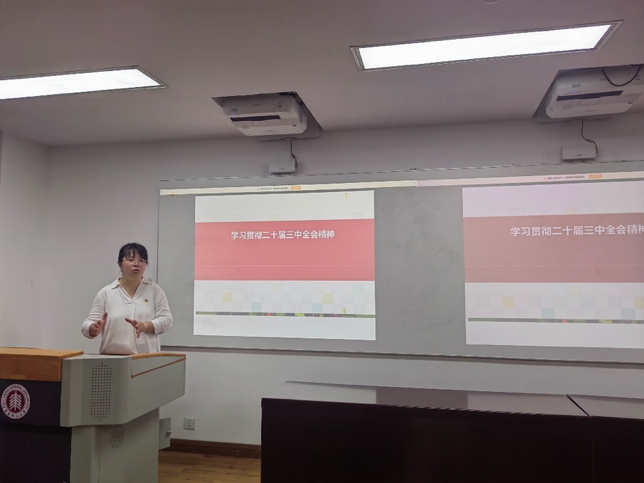会议的第一项议程,由学院党委副书记王婷婷领学党的二十届三中全会精神。王老师从深入改革的重要性、必要性、总目标、指导思想、原则及总体部署等方面展开全面细致的领学。她指出,党的二十届三中全会围绕中国式现代化进一步全面深化改革作出了总体部署,内容与每个人都息息相关,涉及到工作生活的方方面面,需认真学习贯彻二十届三中全会精神。她还特别谈到,全会提出教育、科技、人才是中国式现代化的基础性、战略性支撑,作为高校师生,我们需瞄准赛道,主动出击,为中国式现代化贡献力量。