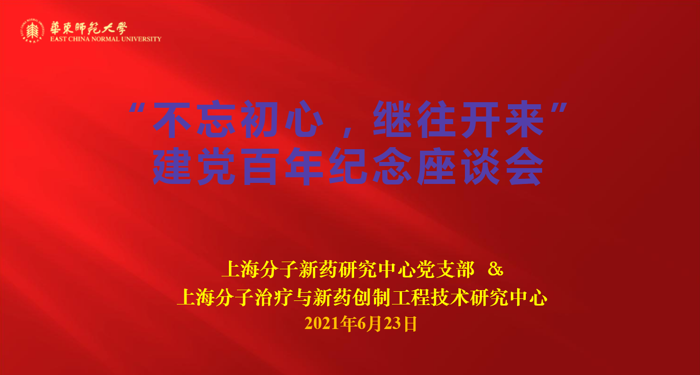 奋斗百年路,启航新征程。为隆重庆祝中国共产党成立100周年,激励和引导支部党员不忘初心、砥砺前行,6月23日下午,上海分子新药研究中心党支部联合上海分子治疗与新药创制技术研究中心(以下简称中心)全体老师,以“回顾中心发展历程,谈建党百年新成就”为主题,在理科大楼B1602会议室组织开展了庆祝建党百年座谈会,工程中心主任周剑、原工程中心主任汤杰、中心全体教师以及上海分子新药研究中心党支部党员等出席活动,活动由支部书记马明亮主持。