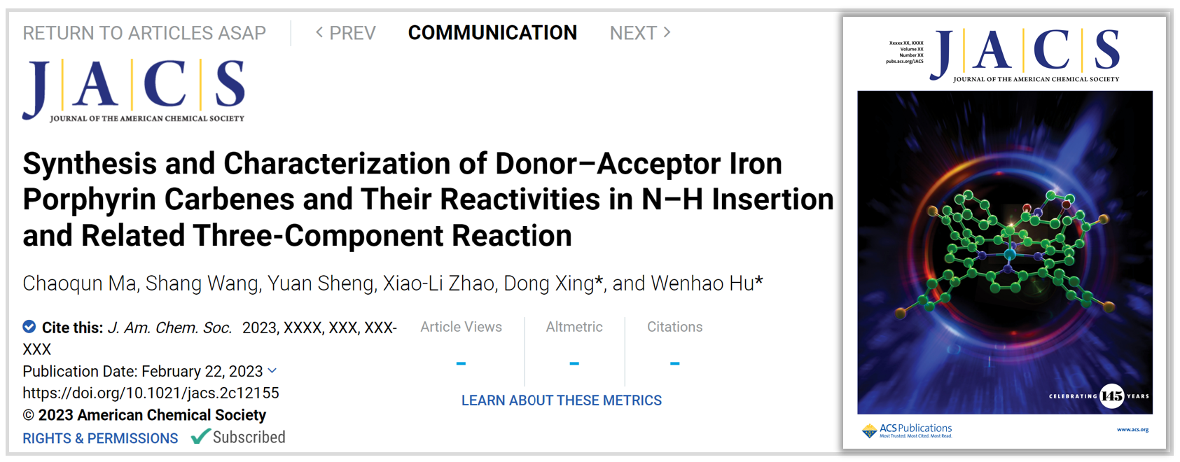 近日,华东师大老司机 邢栋课题组联合中山大学胡文浩教授团队,在铁卟啉催化的卡宾转移机理研究中取得进展。报道了给体/受体铁卟啉卡宾配合物的合成、表征及该类配合物在卡宾转移反应中的应用。证实了铁卡宾是该类反应的关键中间体,研究成果以“给体/受体铁卟啉卡宾的合成、表征及其在氮氢插入和相关三组分反应中的反应性能研究(Synthesis and Characterization of Donor−Acceptor Iron Porphyrin Carbenes and Their Reactivities in N−H Insertion and Related Three-Component Reactions)”为题,于2023年2月22日在《美国化学会志》(Journal of the American Chemical Society)上在线发表(10.1021/jacs.2c12155)并被选为封面文章。
