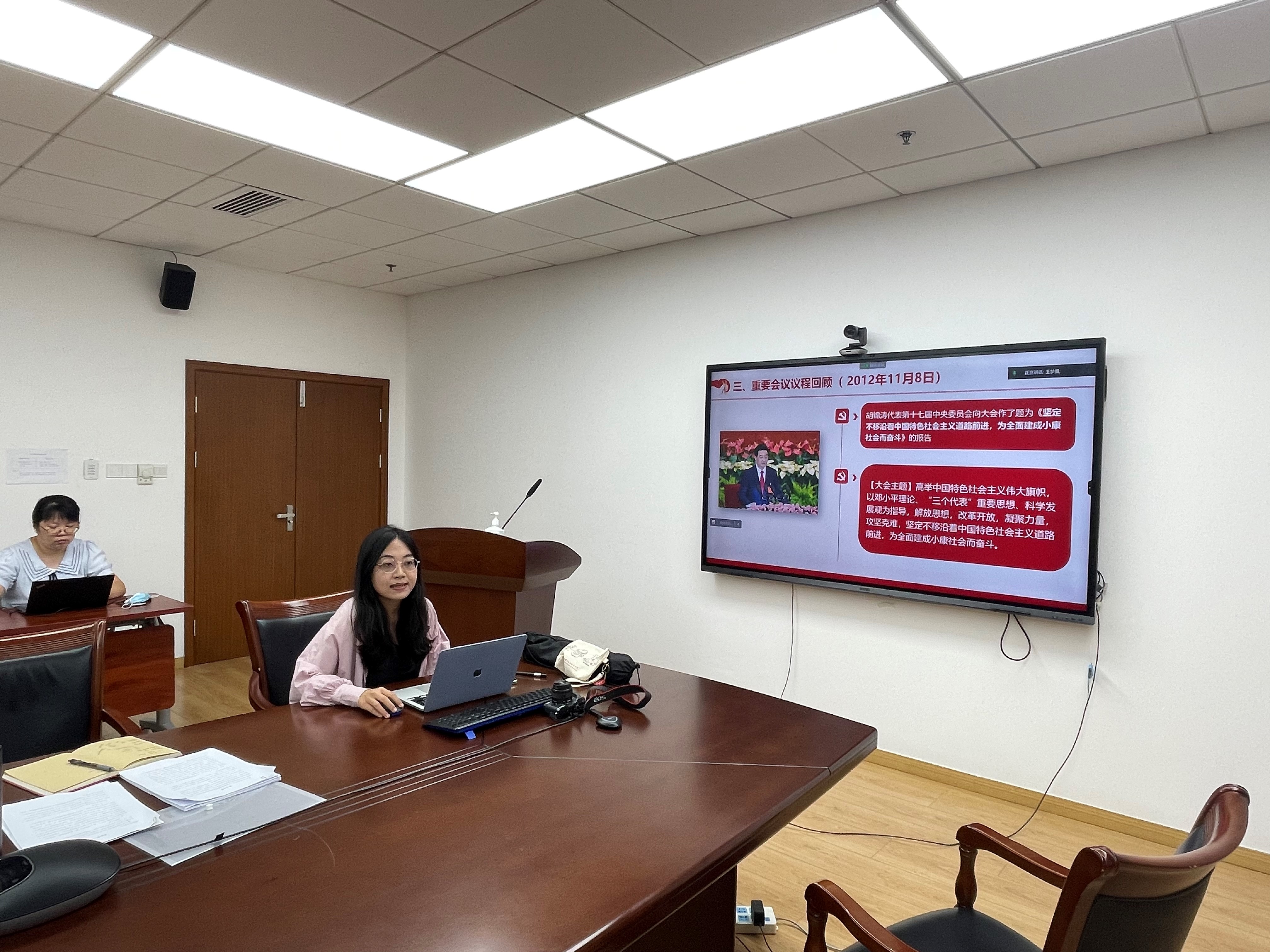 会议的第三阶段,由纪检委员朱通带领大家学习中共二十大的相关知识,指出即将召开的党的二十大,是在进入全面建设社会主义现代化国家新征程的关键时刻召开的一次十分重要的大会,将科学谋划未来5年乃至更长时期党和国家事业发展的目标任务和大政方针,事关党和国家事业继往开来,事关中国特色社会主义前途命运,事关中华民族伟大复兴。党的二十大即将召开,朱老师呼吁大家要把学习习近平总书记重要讲话精神与迎接党的二十大结合起来,接续奋斗、永远奋斗,立足岗位积极作为,满怀信心,迎接党的二十大隆重召开。