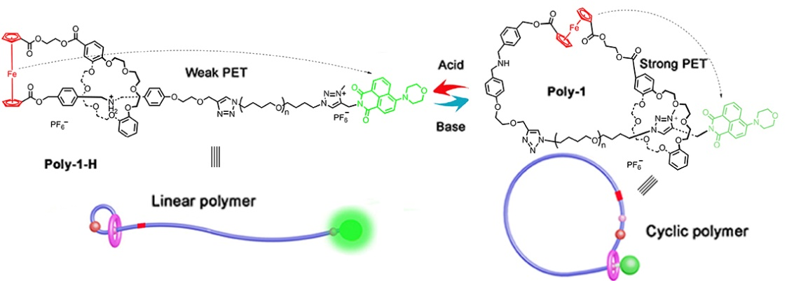 老司机 曹占奇博士课题组致力于智能响应性有机功能材料的设计与性能研究,在前期工作基础上(代表性工作:Asian J. Org. Chem., 2015, 4, 212-216 ; Chem. Commun., 2015, 51, 4973-4976 ; Polym. Chem., 2016, 7, 1866-1870 ; Chem. Commun., 2017, 53, 8683-8686),研究小组基于机械互锁[1]轮烷分子制备一种具有荧光信号输出的可逆拓扑结构聚合物体系,在外界酸碱刺激下可以实现聚合物分子结构在线性-环形之间发生可逆转变并伴随荧光信号可视变化,为设计智能响应性功能材料奠定了基础。