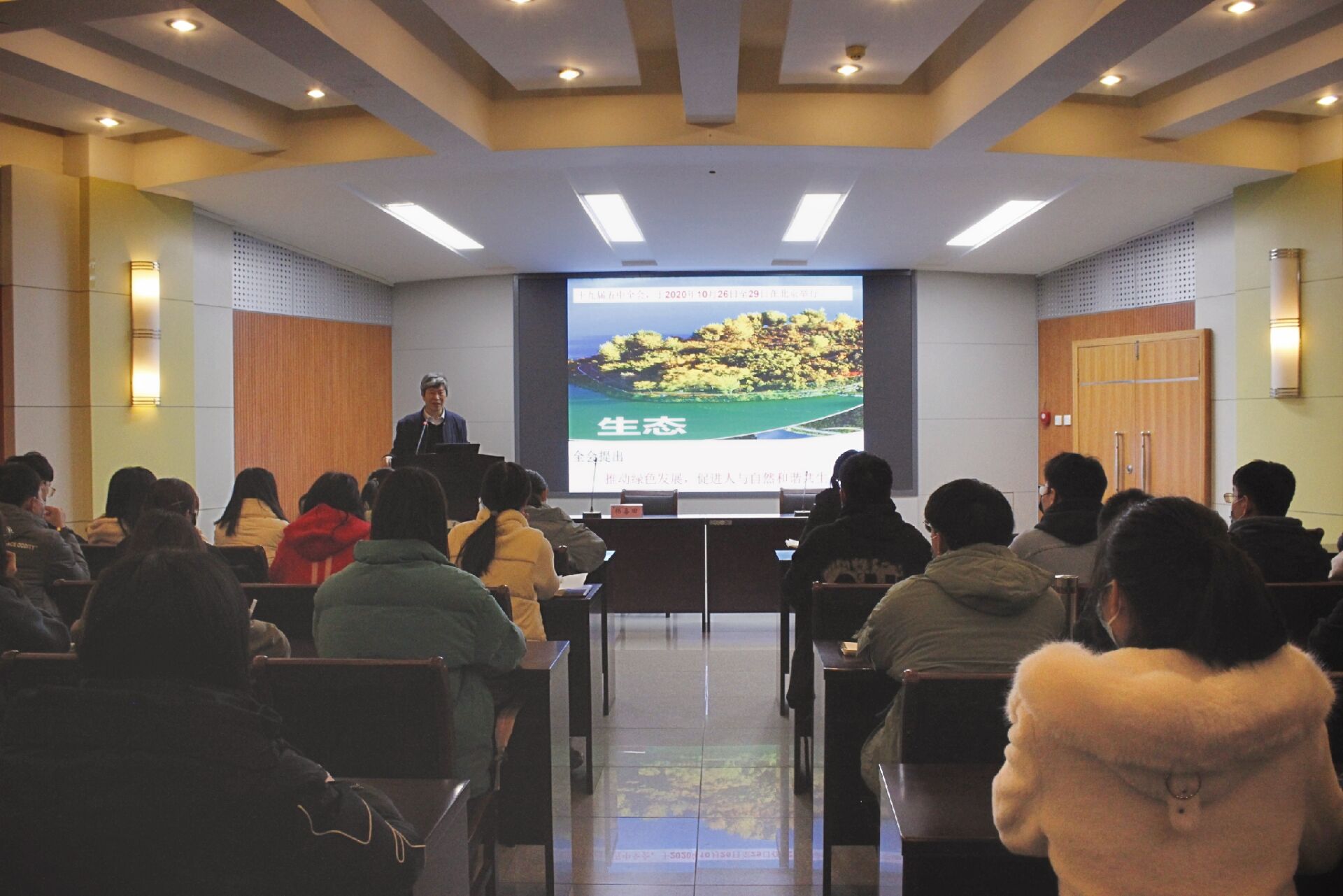 杨喜田从人类文明发展史、全球生态问题、习近平生态文明思想的内涵、生态环境问题的解决策略、中国共产党推进生态文明建设的实践等方面上了一堂生动的党课。他指出,要按照习近平总书记提出的生态文明发展理念,坚持可持续发展战略,治理环境、保护环境,共谋全球生态文明建设,彰显大国担当。他强调,作为农业高校,我们要积极行动起来,在经济结构提质行动、生态功能提升行动、国土绿化提速行动、环境治理提效行动中展现新作为新担当。