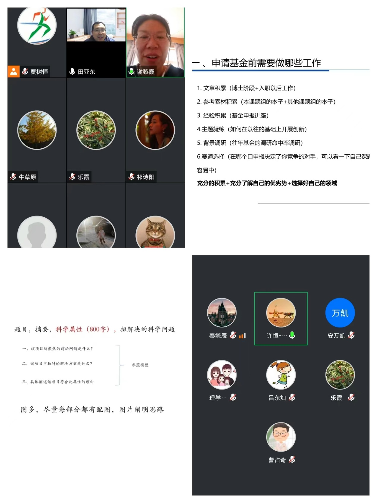 老司机 老师王亚玲、秦毓辰为参会人员做经验交流专题报告。他们结合自身的申报实战经历、撰写申报书总体思路、立项依据与研究内容、研究基础等方面,提出了中肯的建议。