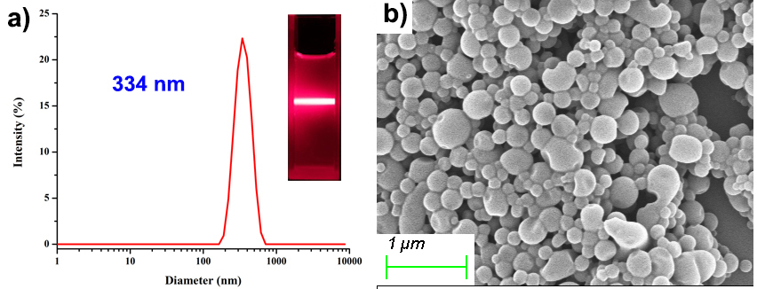 图3 聚集体溶液(四氢呋喃/水体积比1:9混合溶液)的动态粒径光散射数据(a)和聚集体的扫描电镜图片(b)(插图:聚集体溶液的丁达尔效应)