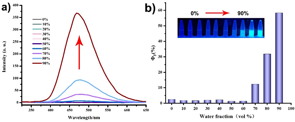 图4 聚集体溶液(不同比例四氢呋喃/水混合溶液)的荧光发射光谱(a)和荧光量子效率图片(b)(插图:365 nm紫外光下,聚集体溶液照片)