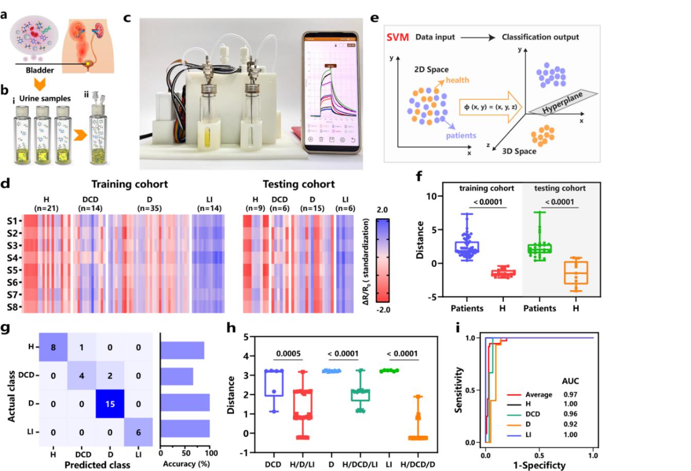 图4. (a,b,c)尿液样本收集、鼓泡、配置智能手机的便携式POCT平台;(d) MHMF电子鼻(标准化)热图;(e) 健康和患者分类的SVM算法示意图;(f) 训练组和测试组中患者与H比较的支持向量机的距离值的箱型图;(g) 支持向量机分类结果H、DCD、D、LI的混淆矩阵;(h) 支持向量机分析得出的H、DCD、D、LI在检验队列中比较的距离值的箱线图;(i) 支持向量机算法分类H和DCD、D和LI的ROC曲线。注:健康组(H)、糖尿病组(D)、糖尿病共病抑郁(DCD)、肝损伤(LI)。