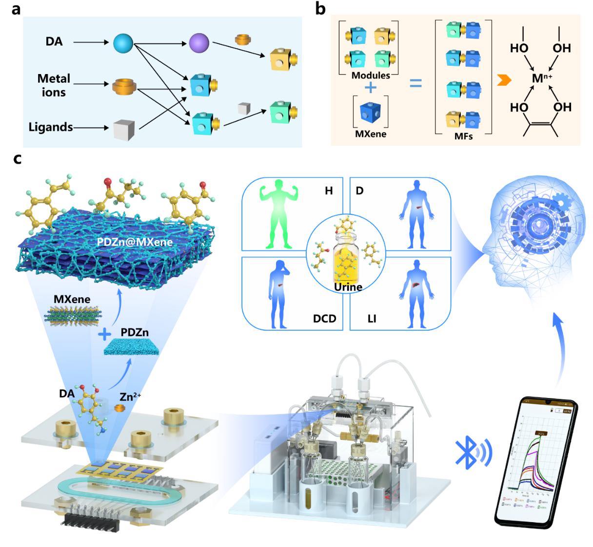 图1:基于配位驱动组装分层多孔MXene框架(MFs)气敏材料构建尿液VOC即时检测平台示意图