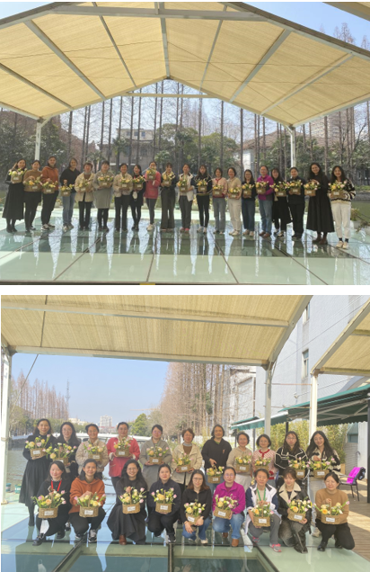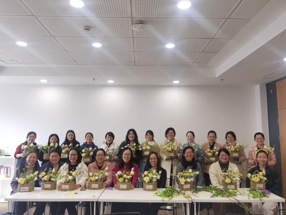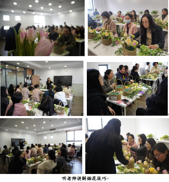 一个个错落有致的花篮在老师们的巧手中诞生,现场的老师们相互交流分享着插花的心得,在芬芳花香中笑语满堂。鲜花衔来了春意,点亮了属于她们的专属节日,花丛明媚,映衬着老师们的如花笑靥。在活动最后,老师们带走了自己用心制作的锦簇花篮,也捎带了一篮春日的祝福与美好的期许。