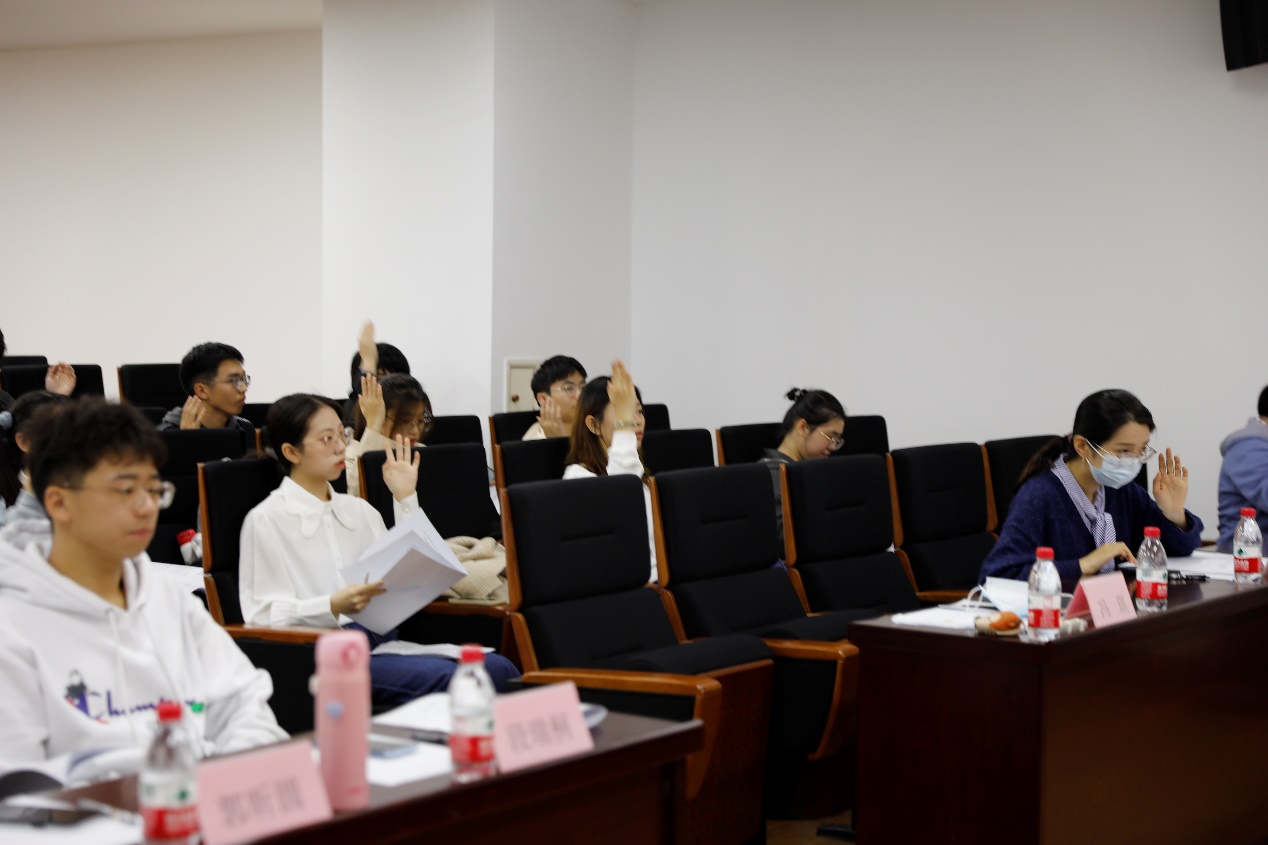 学生代表举手对议案进行审议