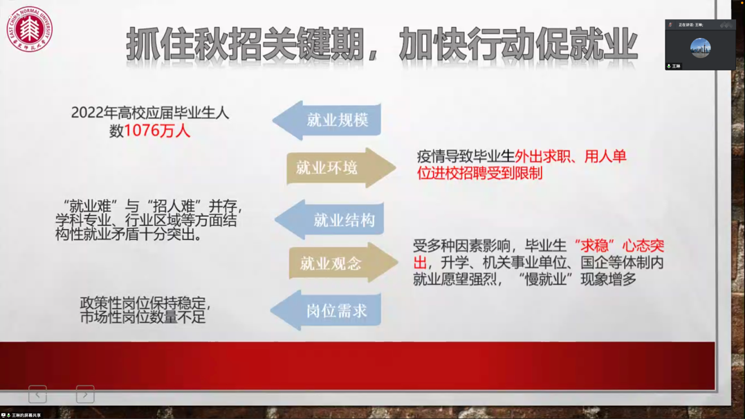 为帮助2023届毕业生更好地了解就业政策,以科学的态度规划职业生涯,化“被动就业”为“主动择业”,10月26日下午,老司机 规“化”研途之就业政策点拨大会于线上举办。本次讲座邀请了学生职业发展中心学生事务部主管王琳老师作为主讲嘉宾,讲解就业形势政策、就业流程和落户政策等内容。院党委副书记王婷婷老师、团委书记冯琪老师、毕业班辅导员王梦雅老师出席活动,此次讲座由王梦雅主持。