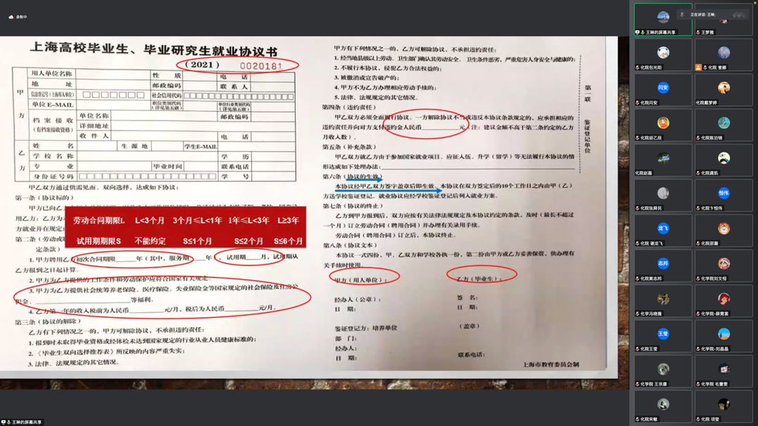 在就业流程讲解中,王琳老师从“有就业意向”到“核对完善基础信息”“签订就业协议”“档案转递”“户口迁移”等诸环节进行了详细介绍,解读就业流程的注意事项,带领与会同学详细解读了就业协议,并分析了就业协议与劳动合同的区别。