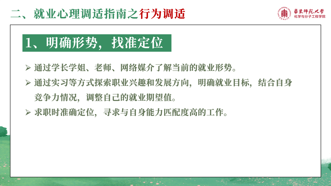 在第二个环节,王梦雅老师针对同学们可能遇到的就业心理困扰提出两种调适办法。一种是情绪调适,王老师带领与会师生一起学习了积极暗示法、注意转移法、理智分析法、放松训练法和合理宣泄法等情绪调适方法;另一种是行为调适,王老师告诉同学们要明确形势、找准定位,整合资源、发掘渠道,做好准备、主动出击,灵活机动、适时调整。