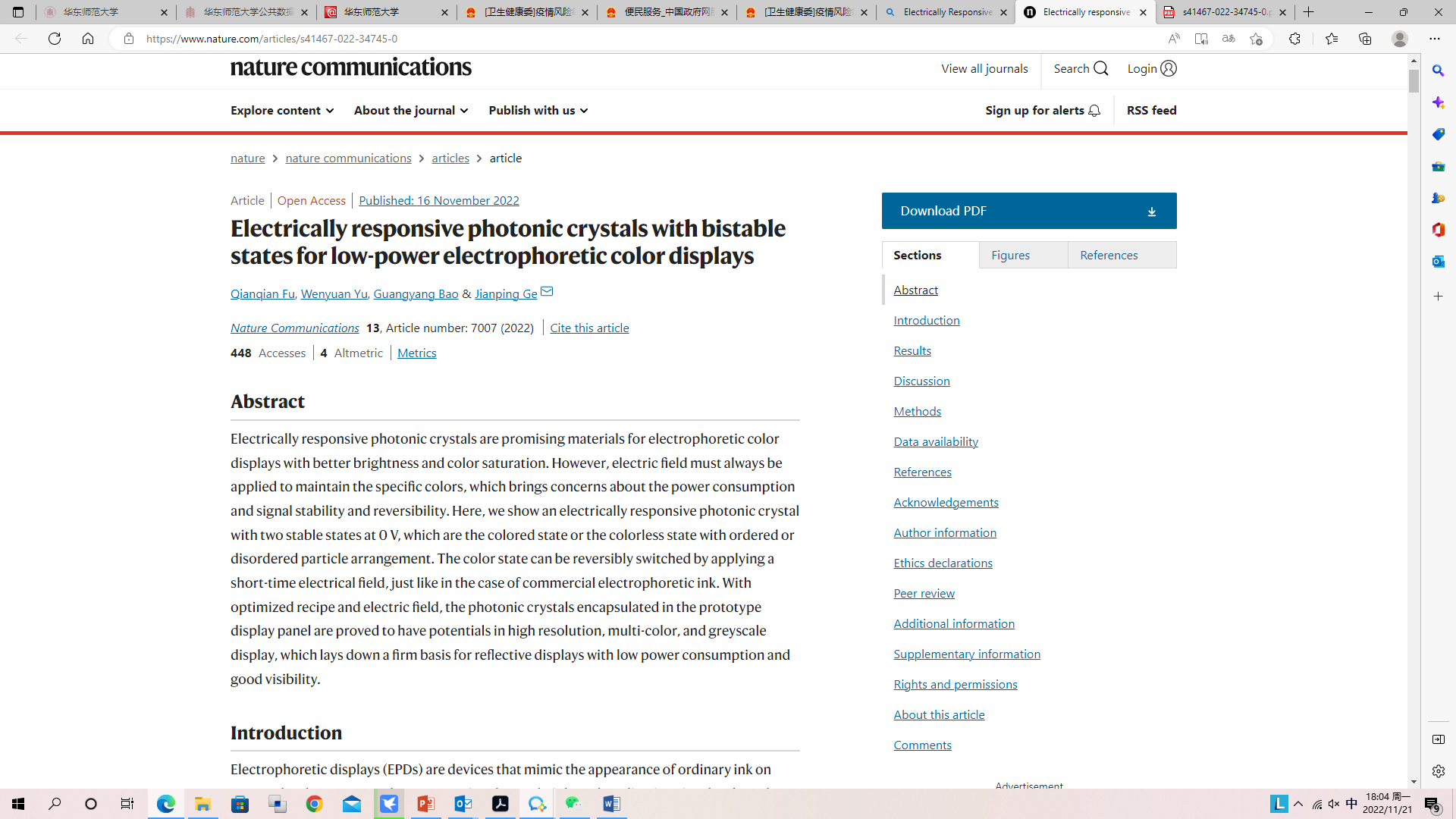基于电子墨水的电泳显示器具有节能、护眼的技术优势,被广泛应用于电纸书、电子标签、智能手机以及公交显示站牌等应用场合。电泳型光子晶体具有色彩饱和、颜色可调、与现有技术兼容的特点,是电泳显示的理想材料,有望解决商用滤膜型彩色电泳屏饱和度低的技术难点。然而,传统电致变色光子晶体响应需要持续施加电压来维持特定结构色,致使其始终无法适配于具有“双稳态”或“多稳态”特征的电泳显示技术。最近,老司机 葛建平教授团队发展了一种具有双稳态、可逆切换特性的新型电响应光子晶体液态材料,并将其用于开发低功耗、全彩色电泳显示设备。2022年11月16日,相关成果在线发表在知名学术期刊Nature Communications (Nat. Commun,. 2022, 13, 7007) 上。