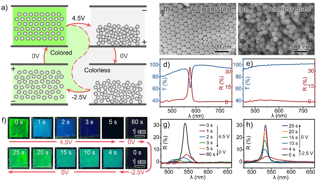 与传统胶体电泳型电致变色光子晶体不同的是,该材料在无外电场作用下具有两种稳态结构,分别为胶粒有序排列的结构色状态以及无序排列的无色透明状态。材料中聚乙二醇的引入是实现双稳态显示的关键,它能够有效提升胶体分散体系的粘度,抗衡无序密堆积状态下胶粒之间的静电斥力,冻结胶粒的布朗运动,从而实现无序状态的稳定维持。此外,两种稳态在外电场短促作用下能可逆切换,实现了稳态显示时无能耗,状态切换时小能耗的理想节能显示。