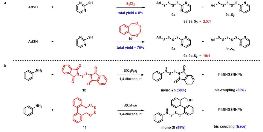 随后,作者对设计的新型中环二硫试剂与现有二硫结构进行了对比。在非对称四硫的合成中,二氯二硫的效率(<8%)与选择性(2.5:1)都非常低,而八元环二硫试剂1d能良好的收率(70%)和优秀的选择性(15:1)得到非对称四硫化合物;在二氮杂二硫化合物的合成中,以Harpp教授发展的试剂1b为二硫源仅能得到30%的单取代产物,而新型环状二硫试剂1f的收率(99%)与选择性(无自偶联)都十分优秀。