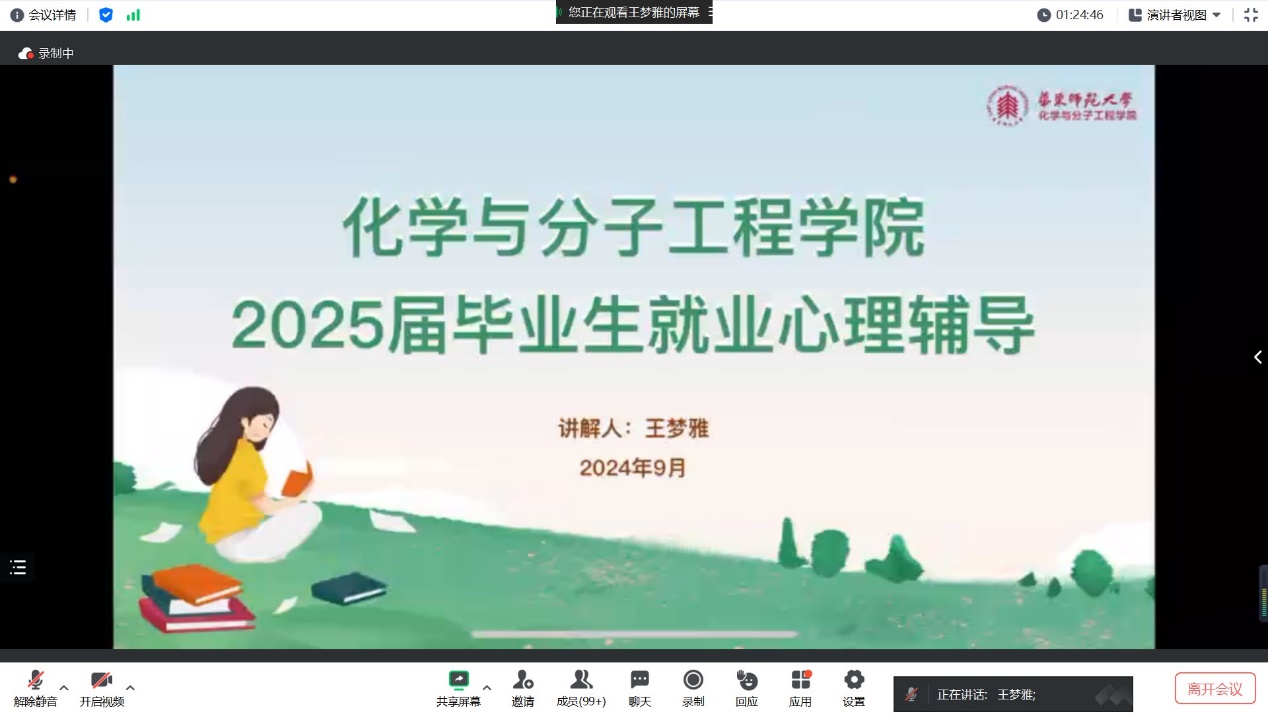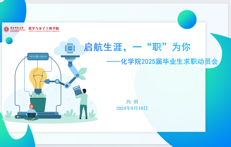 随后,冯琪老师为毕业生们开展了题为“启航生涯,一‘职’为你——化学院2025届毕业生求职动员会”的生涯指导。冯老师为同学们详细介绍了学院2024届毕业生的就业概况,学院2025届各专业毕业生情况,以及2025届毕业生的就业流程重点。