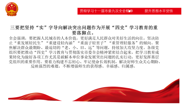 三是要把坚持“实”字导向解决突出问题作为开展“四史”学习教育的重要落脚点。要把学习教育成果转化为做好各项工作尤其是破解本单位事业发展突出问题的扎实行动,更好发挥基层党组织的重要作用。要着力构建不忘初心、牢记使命长效机制,解决好师生众关心期盼、反映强烈的难题,不断增强师生的获得感、幸福感、归属感。