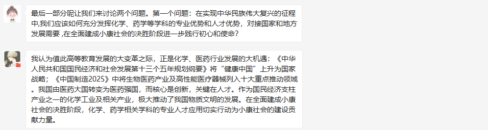 就发挥专业优势对接国家和地方发展需要这个问题同学们讨论认为值此高等教育发展的大变革之际,正是化学、医药行业发展的大机遇:《中华人民共和国国民经济和社会发展第十三个五年规划纲要》将“健康中国”上升为国家战略;《中国制造2025》中将生物医药产业及高性能医疗器械列入十大重点推动领域。我国由医药大国转变为医药强国,而核心是创新,关键在人才。作为国民经济支柱产业之一的化学工业及相关产业,极大推动了我国物质文明的发展。在全面建成小康社会的决胜阶段,化学、药学相关学科的专业人才应用切实行动为小康社会的建设贡献力量。首先,个人应当加强自身专业能力的培养。同时,在知识、行业大融合的今天,应当开阔眼界,自主学习交叉领域的知识。只有二者兼顾,才有可能解决社会生产中的化学、药学相关问题。最后,应当明确的是,作为专业人才,除了需要具备卓越的能力,更应提高个人的思想认识:应当明确化学与人们生活的各方面息息相关,因此属于化学人才的舞台不仅仅局限于某几个所谓高薪企业,而是遍布祖国神州大地。
