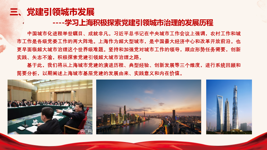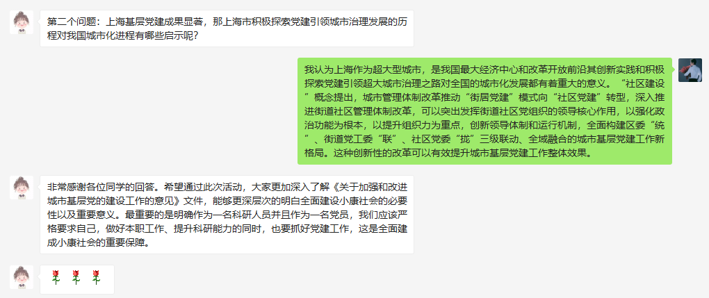 大家就上海市积极探索党建引领城市治理发展的历程对我国城市化进程的指导意义这个问题也展开了热烈讨论。上海作为超大型城市,是我国最大经济中心和改革开放前沿其创新实践和积极探索党建引领超大城市治理之路对全国的城市化发展都有着重大的意义。“社区建设”概念提出,城市管理体制改革推动“街居党建”模式向“社区党建”转型,深入推进街道社区管理体制改革,可以突出发挥街道社区党组织的领导核心作用,以强化政治功能为根本,以提升组织力为重点,创新领导体制和运行机制,全面构建区委“统”、街道党工委“联”、社区党委“拢”三级联动、全域融合的城市基层党建工作新格局。这种创新性的改革可以有效提升城市基层党建工作整体效果。
