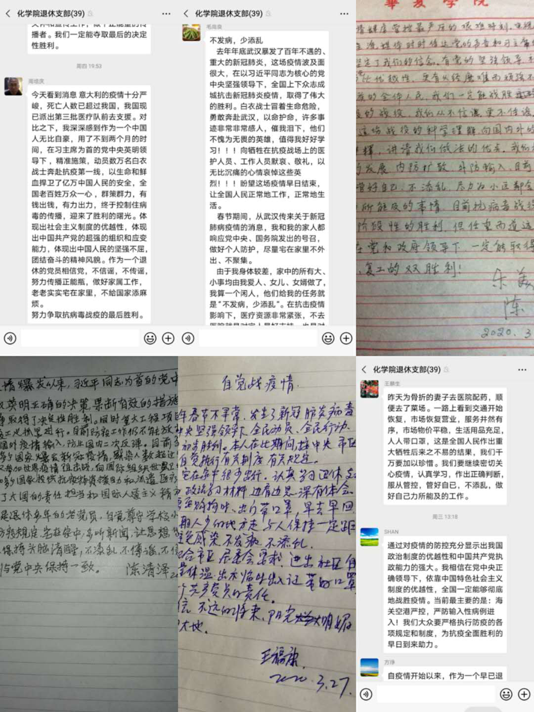 退休支部在支部书记黄明德老师的带领下,在自主学习习近平一系列最新重要讲话之后,在微信群里就“抗议中退休党员如何发挥作用”进行了热烈的交流,退休支部的党员同志们积极抒发了他们对党中央在抗议工作中英明领导的赞叹。在做好自身防护的同时,他们通过向学校基金会、社区捐款,积极做国内外亲人的疫情思想引导工作等多种方式为疫情防控增添正能量。退休不褪色,积极发挥共产党员的先锋模范作用。