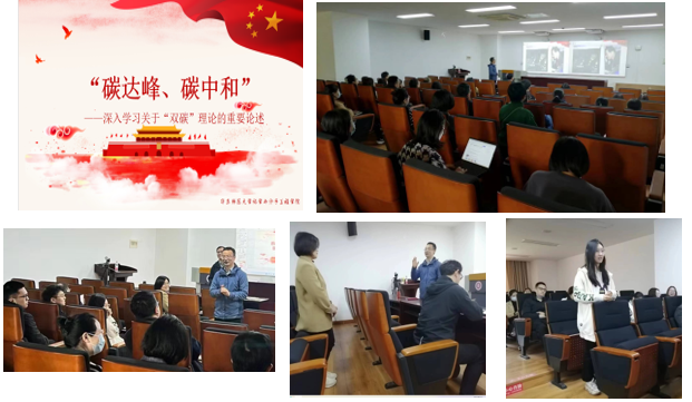 “碳达峰”、“碳中和”(“双碳”)是以习近平同志为核心的党中央统筹国内国际两个大局,经过深思熟虑做出的重大战略决策,事关中华民族的永续发展和人类命运共同体的构建。化学专业有“双碳”研究的学术基础背景,4月26日下午,无机-有机-职工党支部与2022级闵行校区硕士研究生第二党支部就“双碳”开展联合主题党日活动。无机-有机-职工党支部书记李德增主持,支部青年党员教师、青年人才董开武做关于双碳的主题报告,董老师首先用一段《减碳之诺》短视频让大家看到在全球变暖、极端天气频发、新冠肺炎疫情的背景下,党中央提出的绿色发展是极其正确的决策。接着,董老师用开阔的视野、扎实的学识解答了“双碳”的碳为何物,从技术角度和经济角度谈从何处发力推动碳减排和实现双碳目标,并用丰富的图表数据解释国家提出碳中和目标的重大意义,最后结合学院“双碳”研究课题组最新研究成果回答实现双碳我们该何为。接着,与会同志与董老师展开了热烈的讨论。支部书记李德增首先提问:“双碳”目标下,中国经济面临的挑战和机遇?教师支部组织委员陈晓芳老师问我院双碳科学研究到落地转化,还有多远的路要走?学生支部书记贺栖桐同学询问现实生活中农药该如何选择?支部党员、学院党委委员孔爱国提出由二氧化碳为原料合成尿素由实验室到工厂投产,瓶颈是什么?……师生党员探讨热烈,丰富了知识储备的同时也对国家战略的理解与认识更加深入,师生党员表示要积极将个人理想融入国家发展战略,为国家的绿色发展贡献自己的力量。