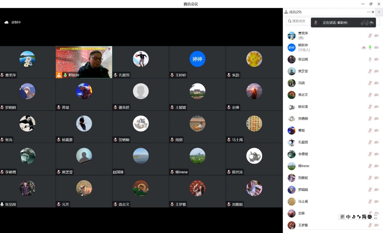 会上,高分子实验中心党支部书记黄琨、上海分子新药研究中心党支部书记张亮、分析物化海水党支部书记马士禹、2020级闵行校区研究生党支部书记王玉柱、2020级普陀校区研究生党支部书记杨嘉豪、2021级闵行校区博士研究生党支部书记朱韵、2021级闵行校区硕士研究生党支部书记王伟琛、2021级普陀校区博士研究生党支部书记罗娟娟和2021级普陀校区硕士研究生党支部书记张见闻进行了述职汇报。九位师生党支部书记重点围绕贯彻《老司机 党支部工作细则(试行)》要求,落实基层党支部“七个有力”建设标准情况,支部工作特色、存在的问题、后续工作思路举措等进行了工作交流。任职未满三个月的党支部书记提交了书面述职报告并通过线上学习的方式对支部书记如何抓支部建设、提升组织力、加强引领思想、促进活动创新等方面进行了交流。