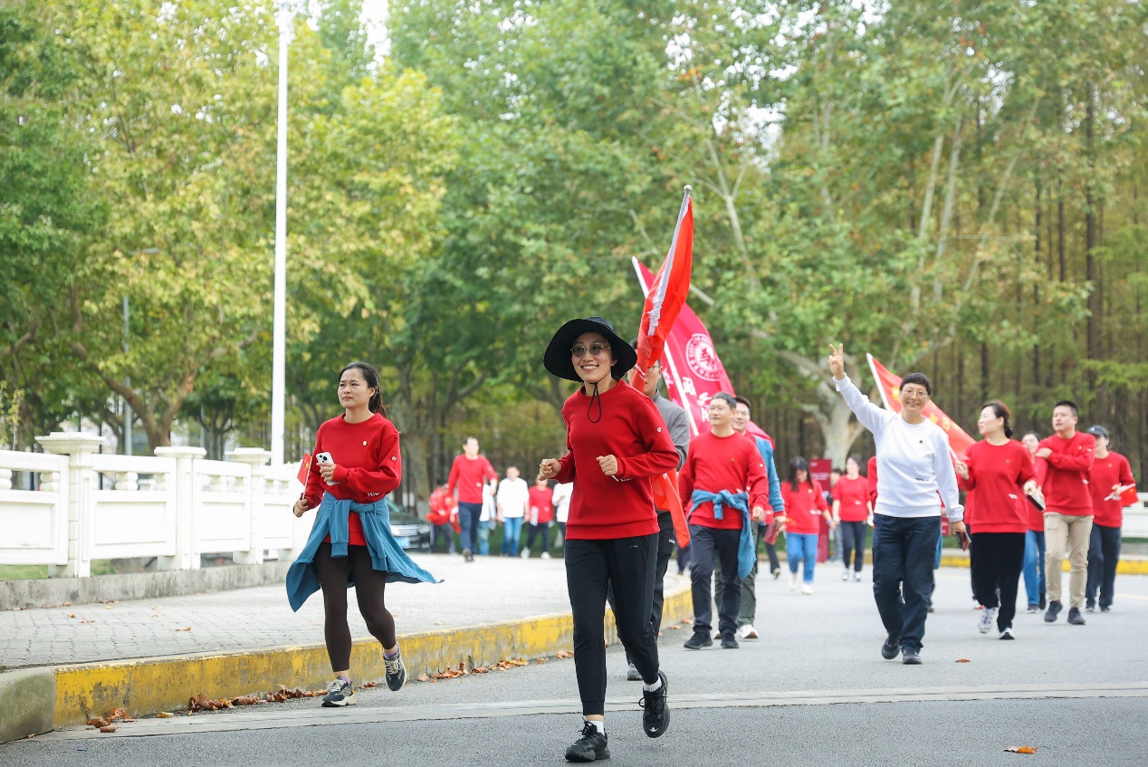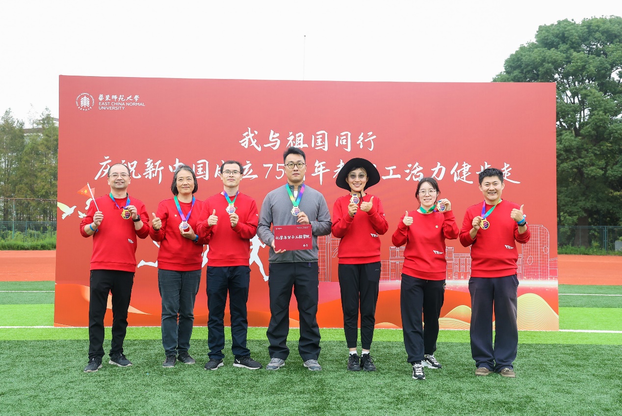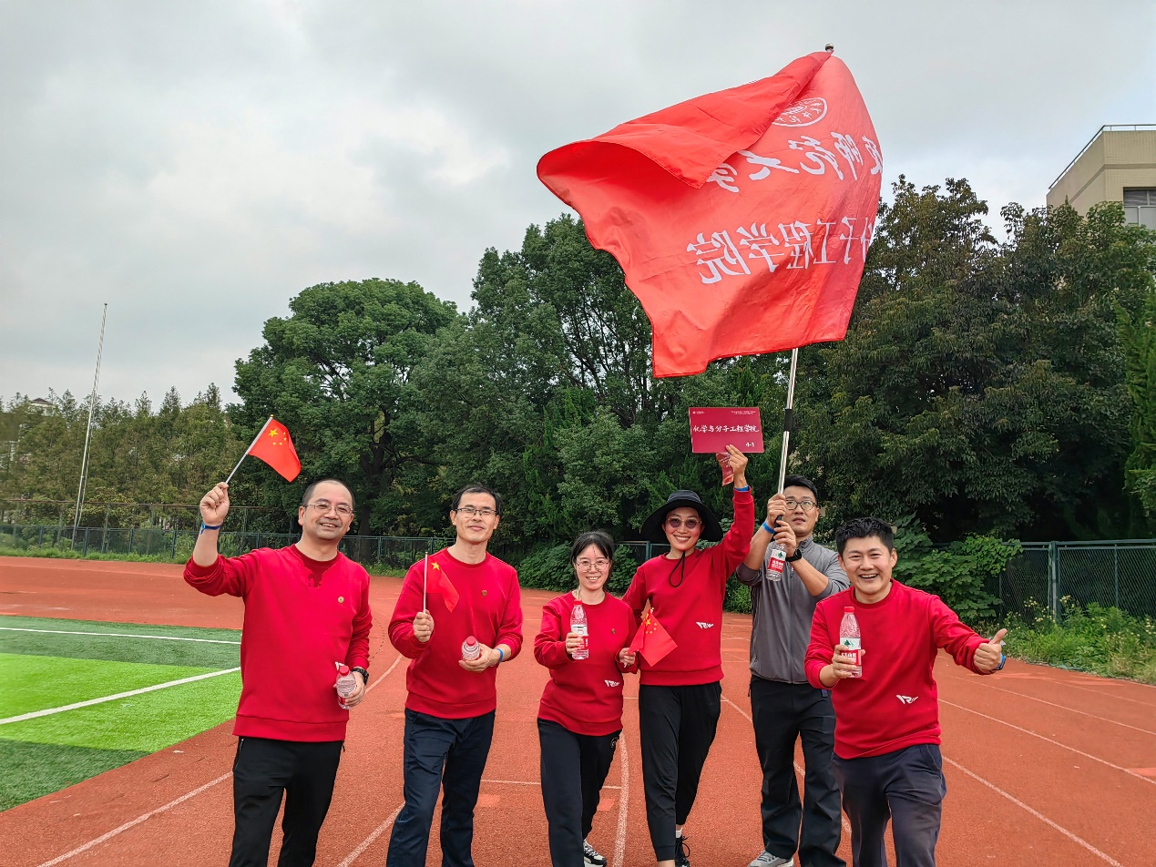 “活力健步走”是此次运动会的新项目,不仅活力满满且意义颇丰,全校教职工代表在校领导的引领下,高举旗帜,以奋发的姿态,按既定的校园路线大步向前,寓意与祖国同行,庆祝新中国成立75周年。化院的老师们用永攀高峰的科研精神,紧跟校领导的大旗,真可谓是冲锋在前,派出的三个代表队中,一队获得一等奖,一队获得三等奖。